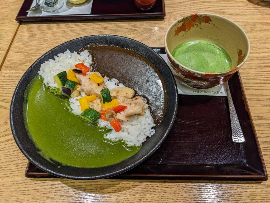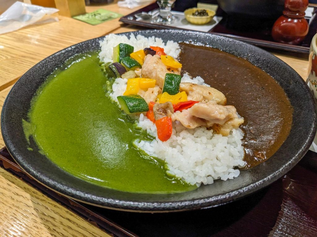 Une fois la commande passée, nous recevons rapidement les plats tant désirés. La présentation, visiblement très Instagramable, semble bien mise en avant. Pourquoi pas, tant que le gout est correct. J’ai commandé un duo de curry au matcha et curry hojicha. Les deux couleurs du curry sont visuellement très agréables, mais qu’en est-il du gout ?