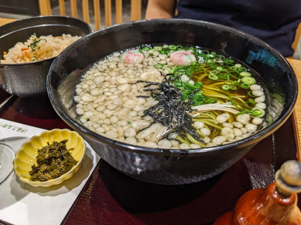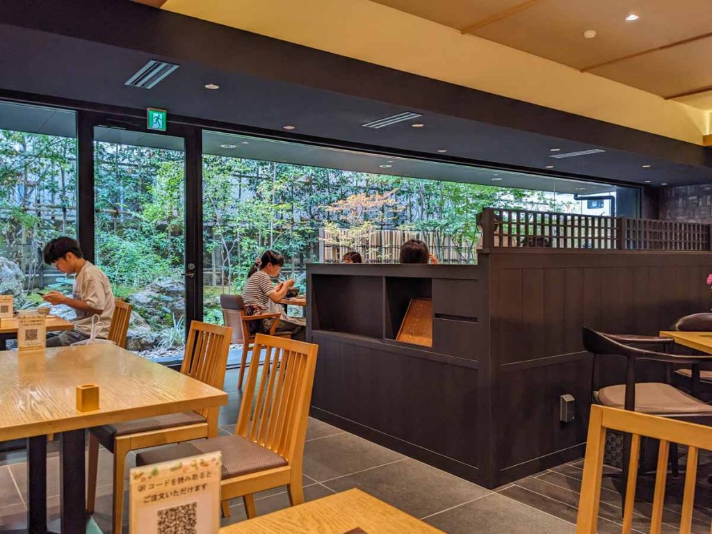 La décoration du restaurant est des plus agréable. Elle nous transporte dans un style japonais classique, tout en bois, avec des lignes épurées, et un petit jardin japonais en fonds. Tout pour se sentir à l’aise. La première épreuve va consister à commander le repas. Comme beaucoup de restaurant au japon actuellement, il faut commander en scannant un QR code sur son smartphone, qui nous redirige vers un menu en ligne sur lequel on choisit ses plats. Sur le principe, c’est très sympa. Si comme moi vous n’avez pas de smartphone avec un forfait internet au Japon, parce que c’est les vacances et que vous avez envie de déconnecter un peu, et bien c’est tout de suite moins sympa… Les serveuses peuvent bien sur prendre votre commande, mais on sent bien que ça ne les arrange pas tellement. Alors évidement, dans un contexte où il y a de plus en plus de touriste, c’est pratique et cela permet aux serveuses de ne pas être multilingue, et les menus sont directement traduit dans toutes les langues principales des clients.